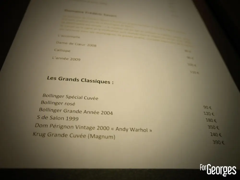 Vins et champagnes à la carte (à partir de 60 euros) et formule au verre (20 Euros les 3).
