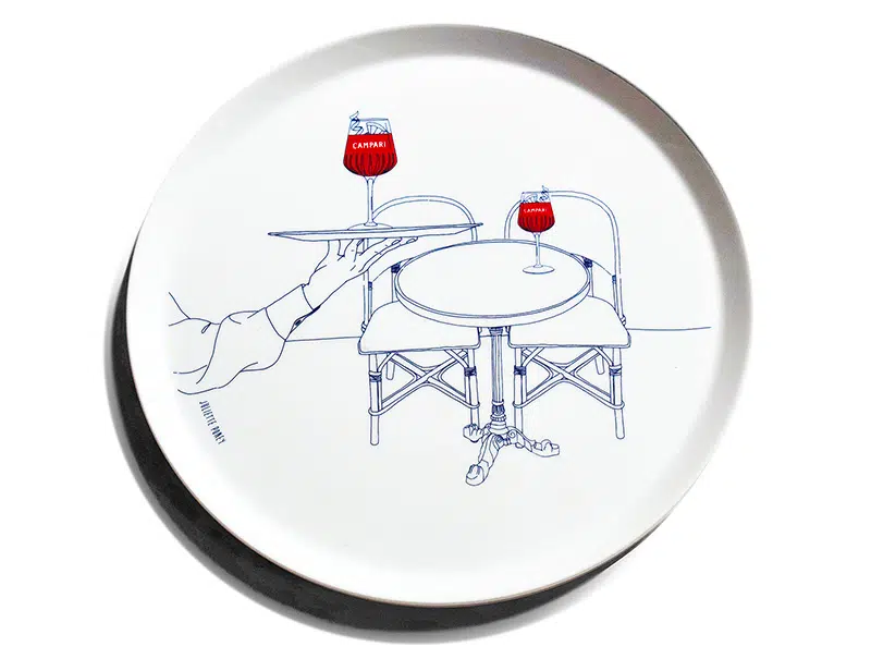 Ce nouvel objet en édition limitée de Campari est donc une occasion supplémentaire de leur rendre hommage. Ce plateau est à la fois un clin d’œil à l’objet de service incontournable de tout établissement et rappelle l’excellence de l’art du service d’un spritz à la milanaise. L’élégance de sa porcelaine blanche met tout particulièrement en valeur les illustrations de Juliette Poney.