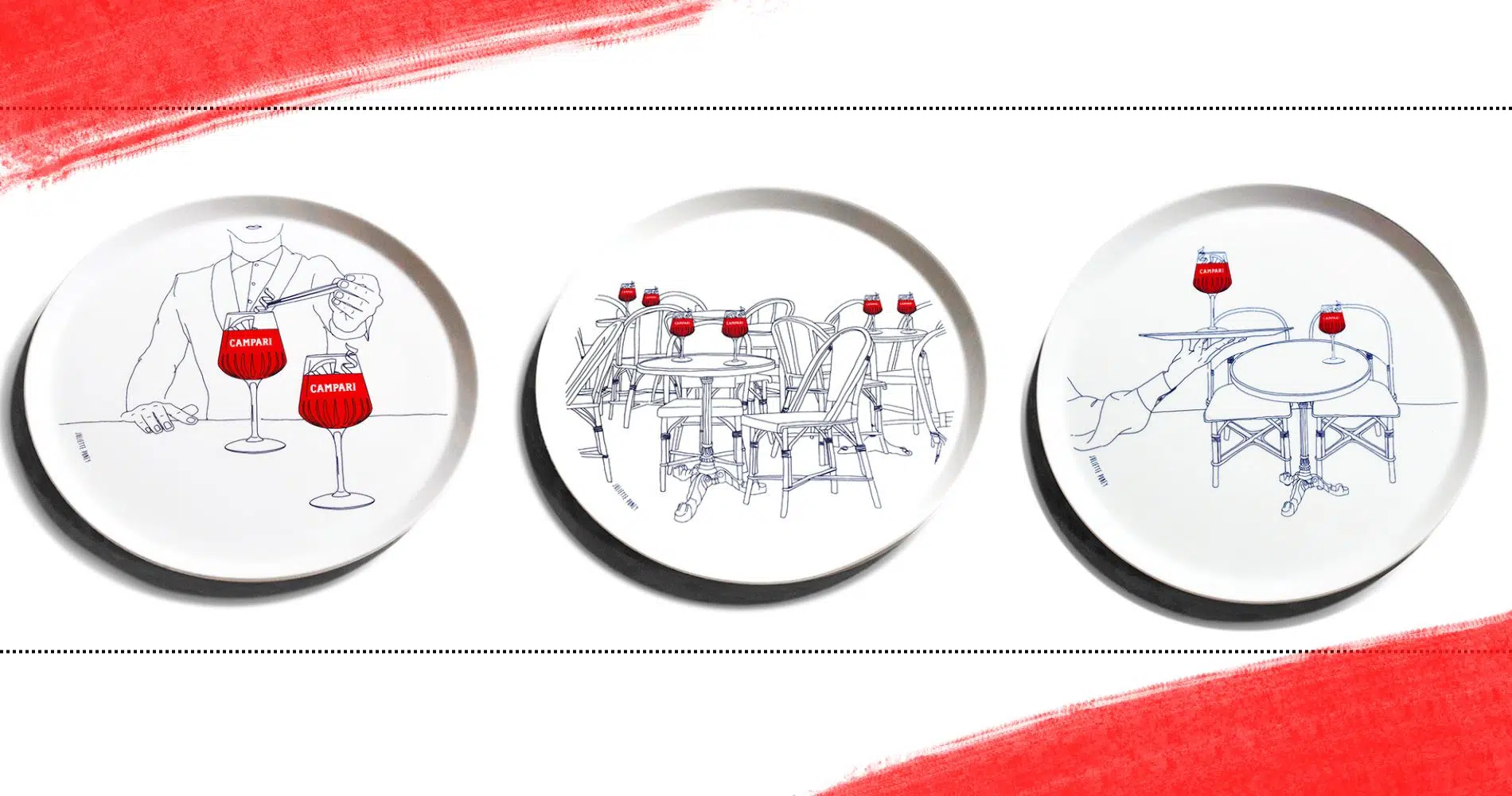 Deux illustrations représentent des terrasses parisiennes, une troisième met en scène le barman en pleine création du Campari Spritz. Trois décors qui reprennent les codes de la marque italienne : un trait de dessin bleu marine porté par des touches d’un rouge profond, couleur emblématique de Campari et signature de Juliette.