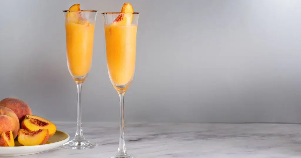 Dans une flute, versez la purée obtenue par 2 pêches jaunes passées au mixer (en ayant retiré les noyaux au préalable) et 8 cl de champagne brut frappé. Commencez par la purée, puis versez dessus le champagne, sans oublier de remuer délicatement quelques secondes.