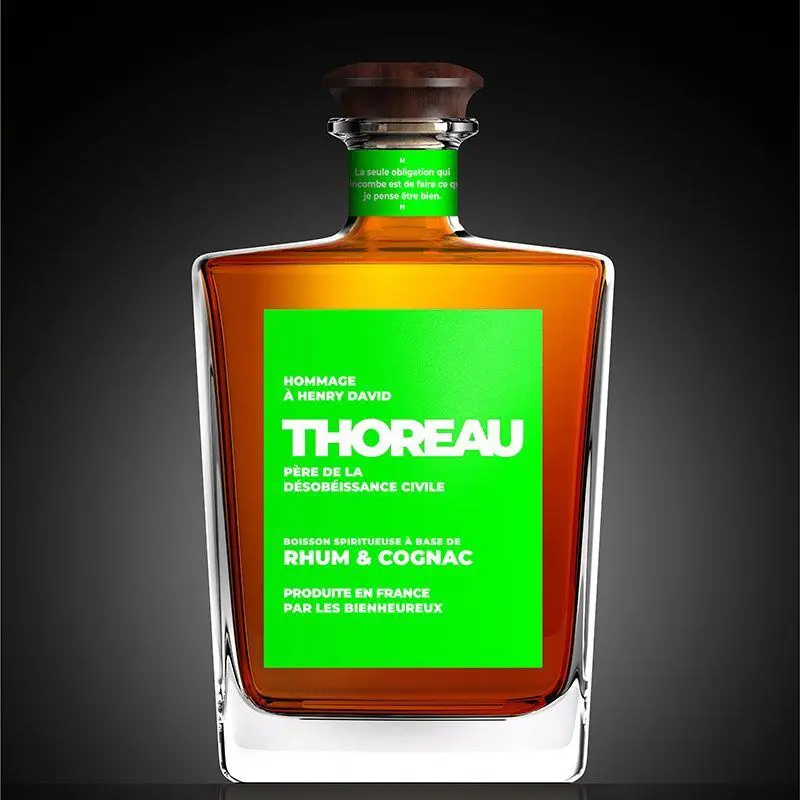 Une boisson spiritueuse inédite à base de rhums guatémaltèques (70%) et de Cognac V.S.O.P. (30%). Elle est créée en hommage à Henry David Thoreau, philosophe, poète et naturaliste américain du 19ème siècle : le père de la désobéissance civile. Ses écrits ont profondément marqué l’équipe des BIENHEUREUX en les encourageant à exercer leur liberté d’innover pour atteindre l’excellence organoleptique.