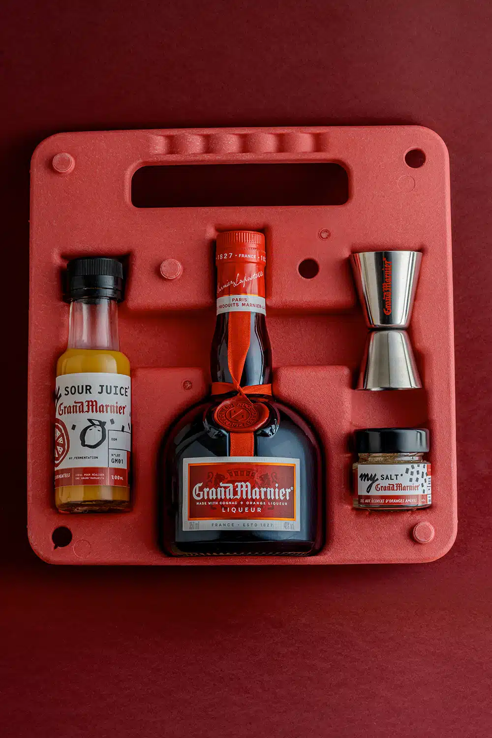 Made from potato pulp, this eco-designed gift set is unlike any other. Thermoformed in a deep red, it perfectly embraces the iconic 35 cl bottle of Grand Marnier Cordon Rouge. A piece designed to last, tactile, graphic, almost a collector's item, with only 150 copies in circulation, in other words, a treasure hunt.