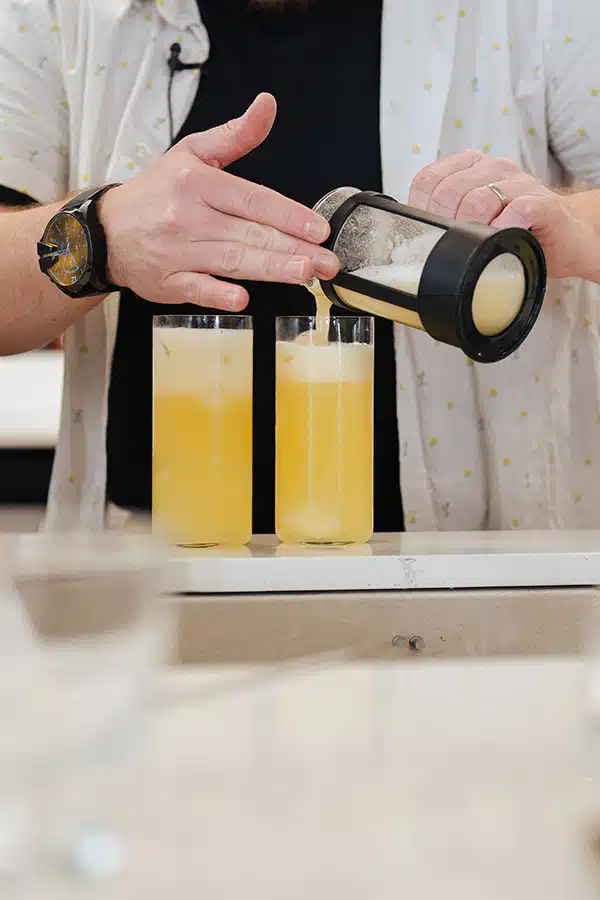 Ce soda de pamplemousse était composé d’un assemblage de jus de suprême de pamplemousse et de jus de zestes confits, déglacés à l’eau-de-vie de framboise. Le CO2 de ce soda vient titiller une molécule aromatique du pamplemousse, la nootkatone, qui offre alors des arômes de jasmin très plaisants.