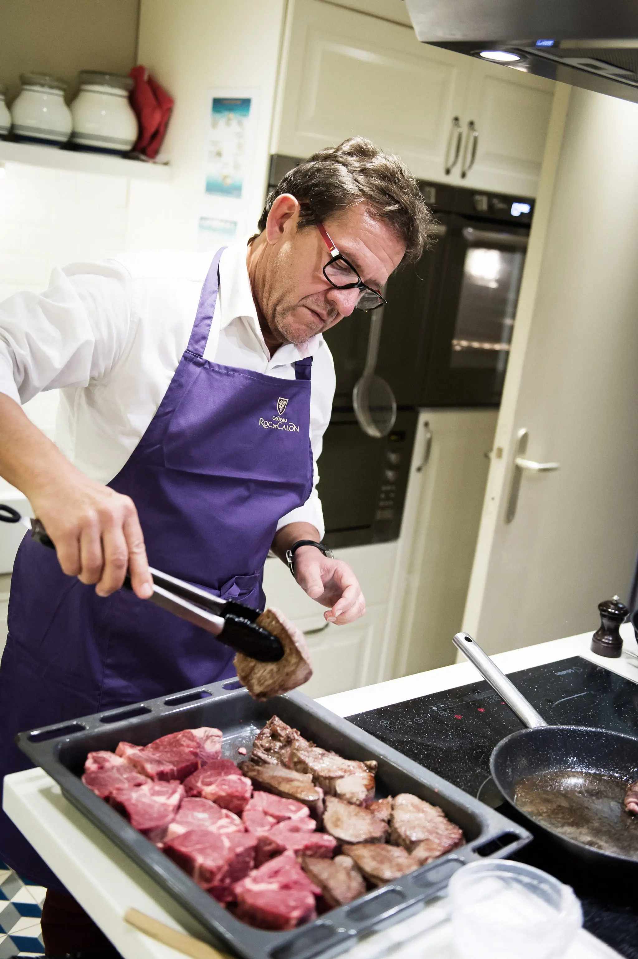 En attendant que nos filets de boeuf en croute de moelle finissent de dorer au four, nous dégustons notre verre : un Château Roc de Calon, un merlot fin et élégant. La bonne alchimie du groupe se renforce, les duos se mélangent. Nous racontons nos parcours, nos histoires, nos passions. Entre chaque plat, la règle est de changer de place. Bernard nous apporte son vin fétiche issu de sa propriété : Écrin, puissant et charpenté qui viendra révéler nos plats mitonnés.