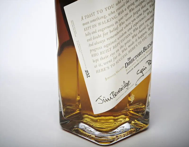 Côté design, l'étiquette laisse place à un texte sur la réussite. La première phrase est : “A TOAST to you who came from nothing, and made it mean something, who crossed the tracks, took the knocks and KEPT ON WALKING” . Le logo est lui relégué en tout petit dans le bas de l'étiquette. Un hymne à la réussite de ceux qui sont partis de rien, réalisé avec un soucis du détail et de l'artisanat comme reflet de la qualité du Whisky. Réalisé par l'agence londonienne Love.