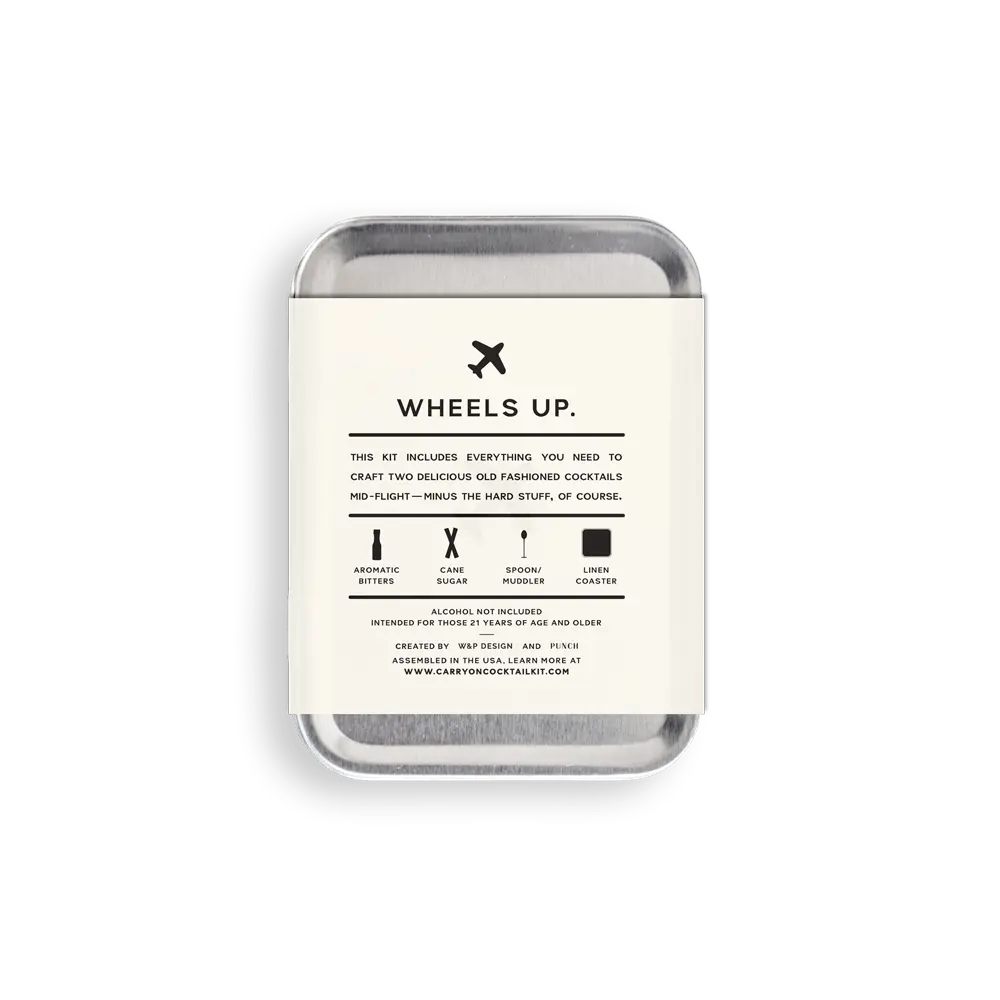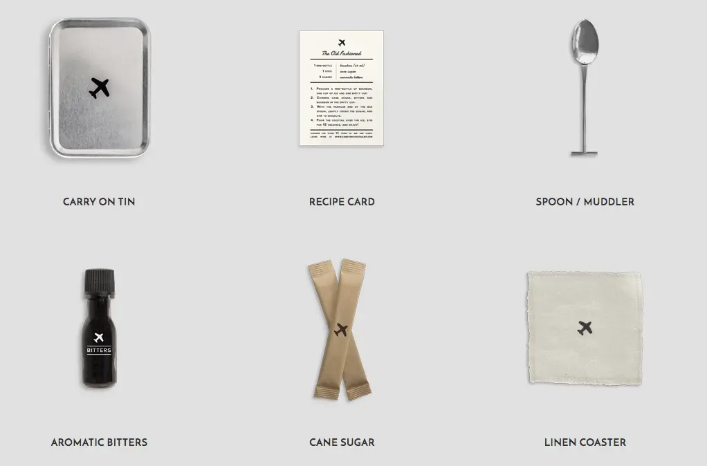 Pas de shaker malheureusement (sécurité oblige) mais l'essentiel pour faire votre petit cocktail dans l'avion est présent : cuillère, bitters, sucre de cannes... Bref le nécessaire pour épater vos voisins de siège et faire le show auprès des hôtesses. fruit d'un partenariat entre W&P design et Punch, vous n'aurez plus qu'à commander une mignonette de Bourbon dans l'avion et le tour est joué !