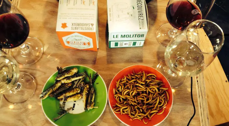 Une initiative originale que nous vous présentons aujourd'hui sur ForGeorges présentée par le Petit Ballon, marque qui vous propose chaque mois 2 bouteilles de vin livrées chez vous. Sauf que cette fois-ci l'accord mets vins est quelque peu étrange puisqu'il est à base d'insectes, de criquets et de molitors plus précisément. Les molitors sont des vers de farine au sésame & cumin, ail & fines herbes, soja impérial. Les criquets sont eux de tailles plus grosse et... il faut enlever les ailes avant de les manger ! C'est bon vous êtes toujours là ?