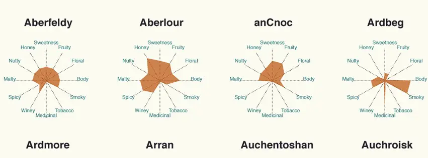 Le whisky, sûrement l'un des alcools les plus passionnants, mais aussi les plus complexes qui soient. Bien souvent lorsque l'on trouve chaussure à son pied, on y reste scotché. Et c'est bien dommage, car il y a tant de saveurs à découvrir. Donc Georges vous a trouvé une infographie qui vous permettra de mieux comprendre la marque que vous aimez et de trouver d'autres whiskies qui s'en rapprochent et pourquoi pas même d'autres qui s'en écartent un peu (mais pas trop, il ne faut pas être fou non plus !).