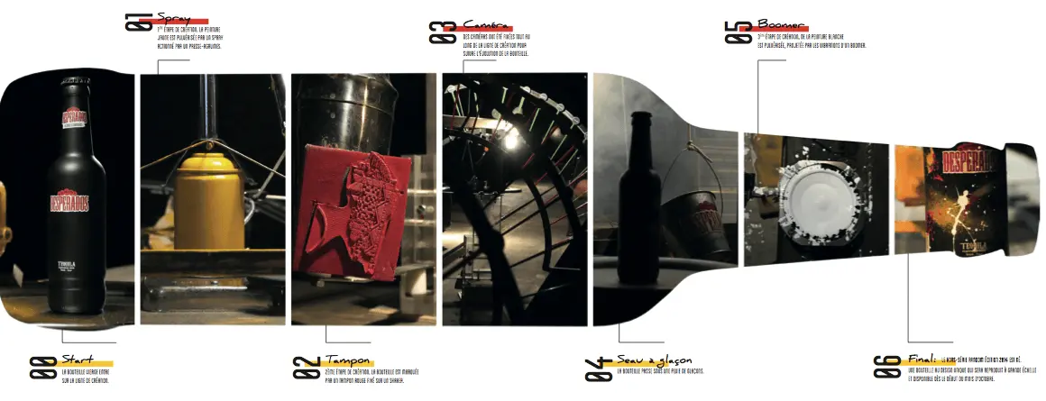 365 jours de travail ont été nécessaires à Desperados et à 9ème concept pour concevoir dans une toute nouvelle chaine de production dédiée à la création de ces bouteilles inédites. Cette chaine constituée d'instruments hétéroclites est un objet d'inspiration urbaine – Une invention Vernienne. Version citadine.