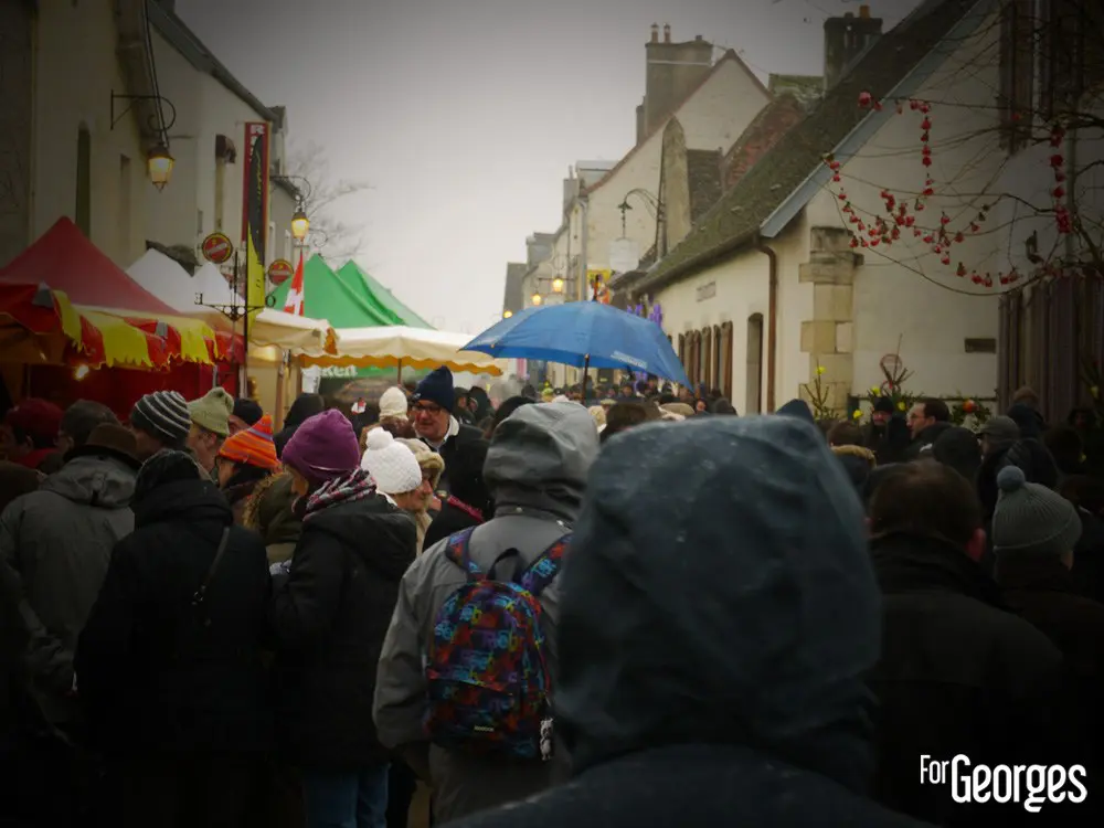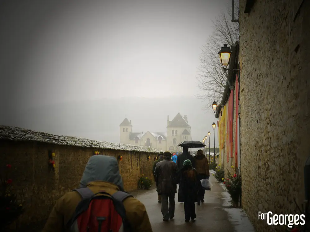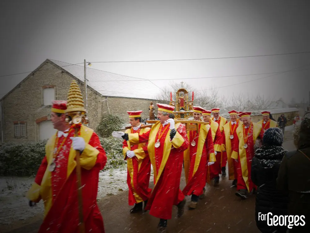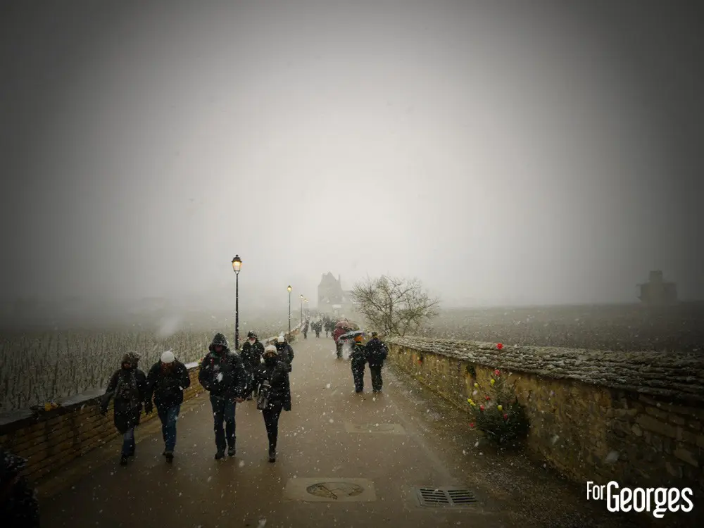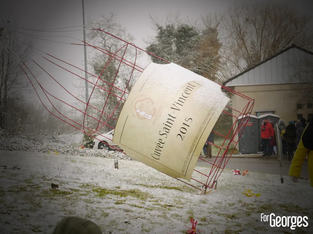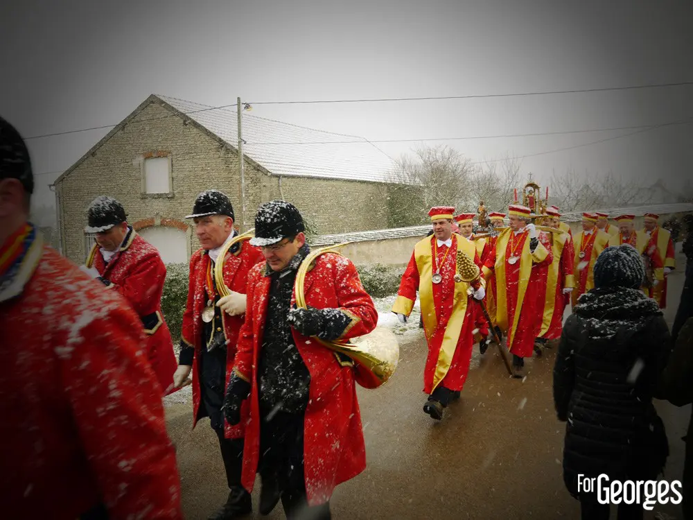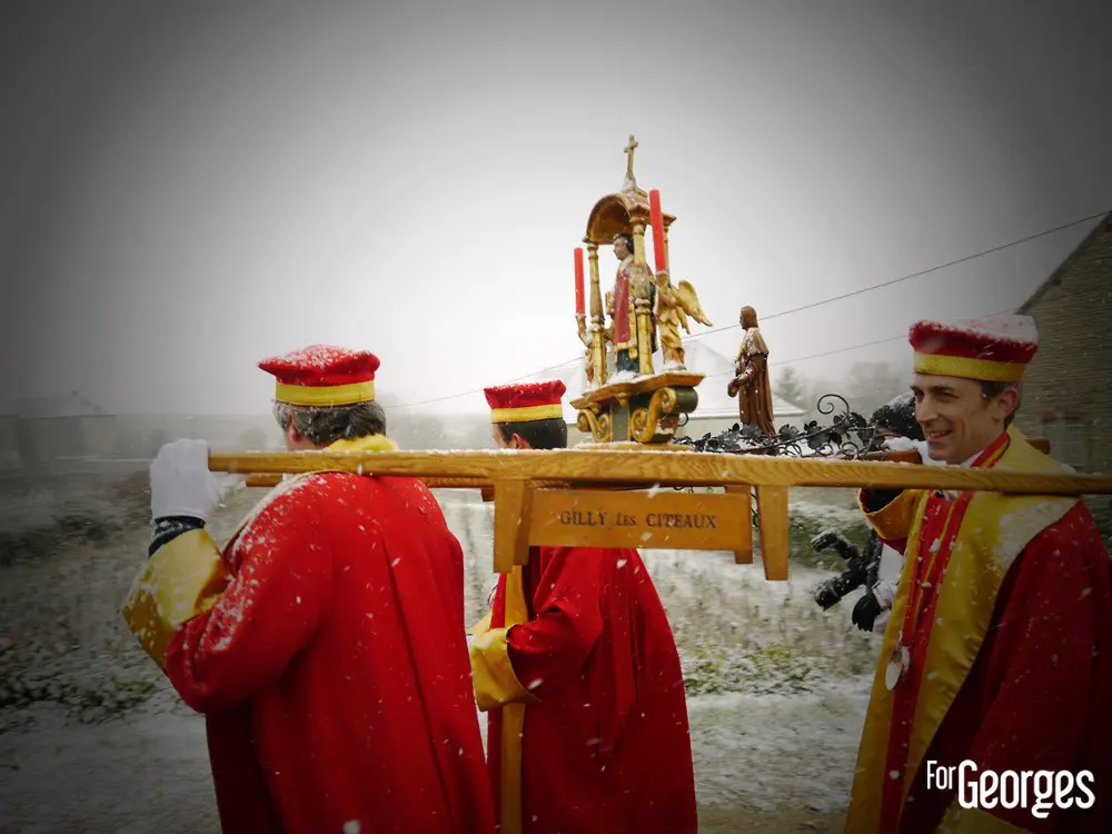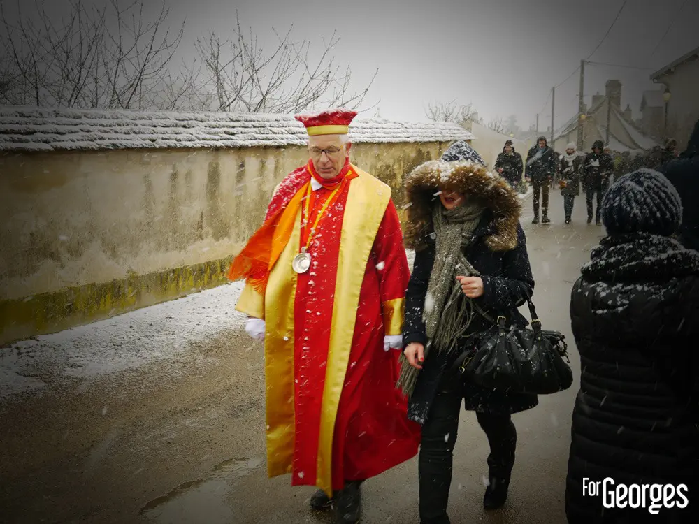 Samedi 24 Janvier. Sous une neige bâtante, le début des festivités de la 71eme Saint Vincent tournante,est lancé ! La plus grande fête viticole de Bourgogne. Ce n'est pas le froid qui va refroidir la volonté de Georges. Après Saint Aubin l'année précédente, c'est au tour des prestigieux villages de Vougeot et Gilly les Citeaux d'accueillir quelques 40 000 visiteurs (estimés) durant tout ce week-end.