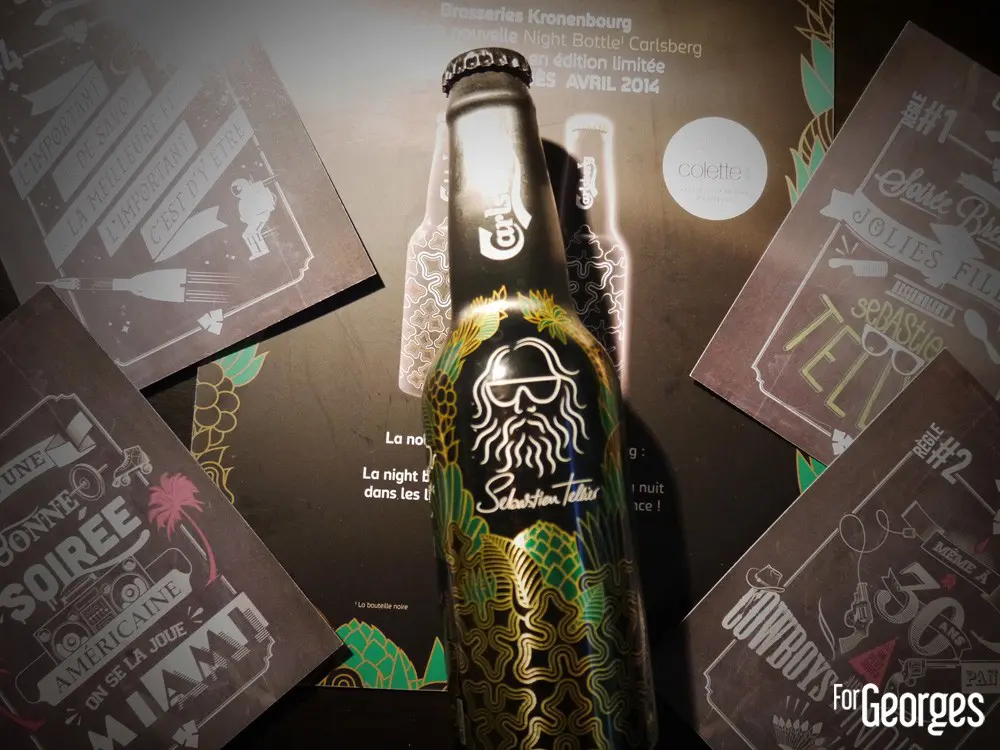 Carlsberg avait frappé fort en 2013 avec ses soirées Unbottle Yourself avec les 2 many DJs. Cette année la marque de bière frappe encore plus fort puisqu'elle s'associe à Sebastien Tellier . Pour l'occasion une "night bottle" voit le jour : une sublime bouteille noir mat avec des dessins psychédéliques colorés. On peut même voir sur la face la célèbre tête du chanteur avec sa barbe et ses lunettes de soleil.