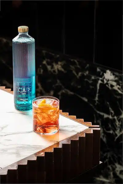 CAP Gin s’appuie sur 9 essences aromatiques qui symbolisent la Côte d’Azur : une base classique de genévrier et de coriandre, sur laquelle se superposent la racine d’angélique, le mimosa, les grains de poivre rose, la fleur d’oranger, les zestes de citron et d’orange ou encore la rose.