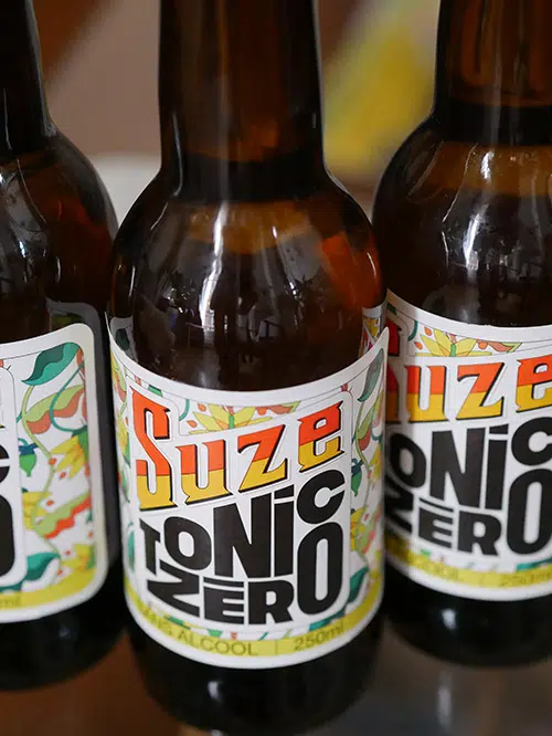 En fait, tout est détonnant avec ce nouveau produit Suze Zéro Tonic : de la Suze en mode zéro alcool, mais déjà mélangé avec du tonic et en format 25 cl ready to drink ! Sacré grand écart avec ce dont on pouvait être habitué avec Suze. Et pour ne rien enlever à l'expérience : les étiquettes du packaging sont canon, façon "tropical street".