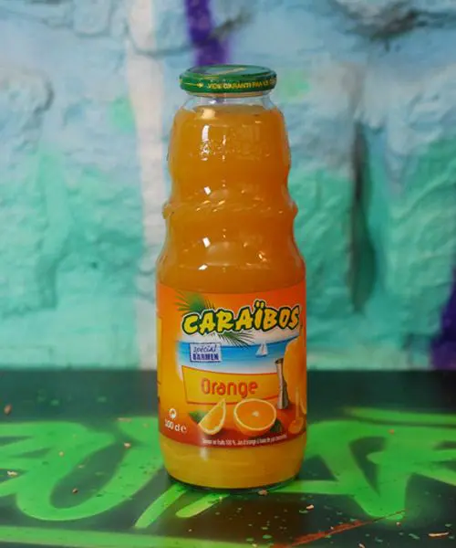 Infusion froide de safran dans du jus d'orange Caraïbos, gingembre frais, cordial de pois chiche artisanal, soda jus de cannelle / pomme Caraïbos fait maison.
