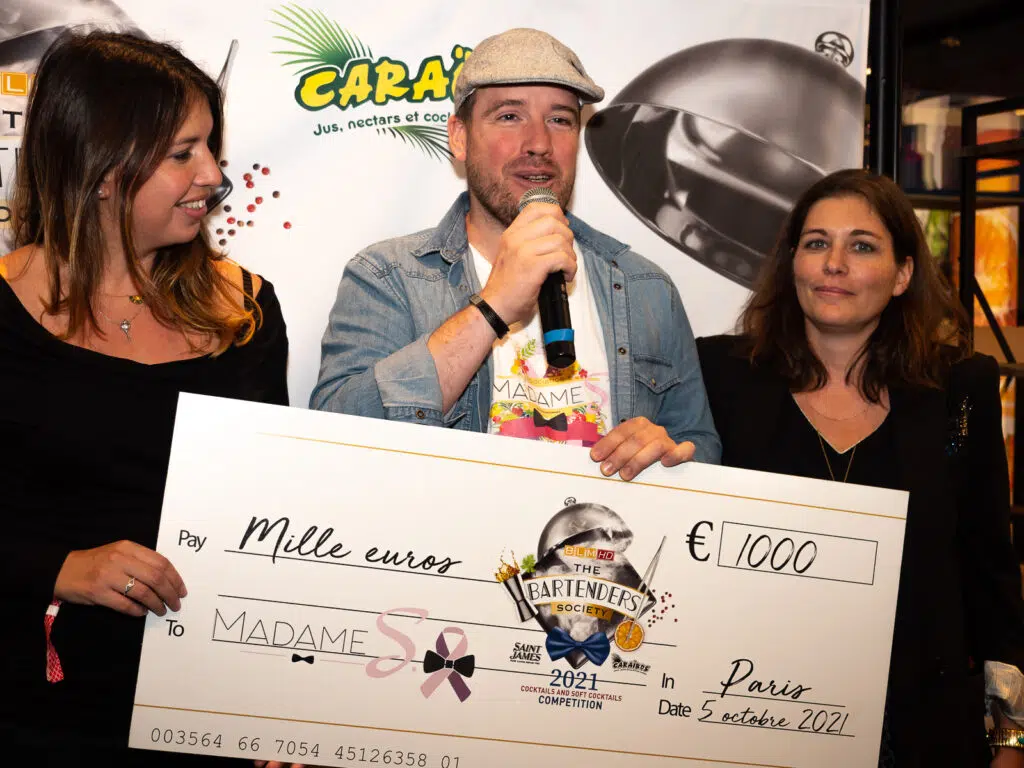 Dernière ligne droite, la soirée bat son plein. Ce sont plusieurs centaines de cocktails que les 4 finalistes doivent sortir et expliquer avec un objectif : conquérir le palais et le coeur du public qui votera pour son bartender préféré. La lumière se tamise, il est l'heure du podium, en commençant par le don de 1000 euros à l'association Madame S, fondée par Mathieu Gouret du Santeuil Café.