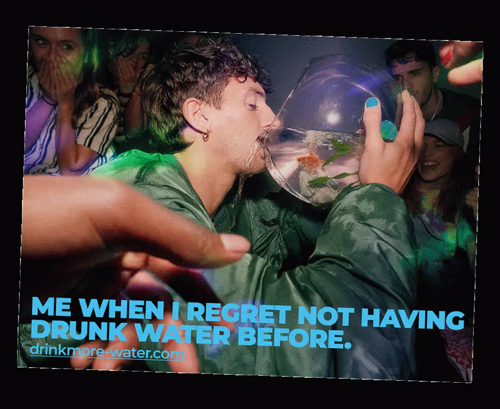 Cette deuxième édition va désormais encore plus loin de manière visuellement impactante et audacieuse au service de la consommation responsable. Son message vise à promouvoir auprès de la GenZ la consommation d’eau pour réduire les effets négatifs de l’alcool. Les conséquences d’une consommation excessive sont ainsi clairement mises en lumière par des visuels et vidéos incarnant des individus buvant de manière déraisonnée de l’eau en lieu et place d’alcool. L’objectif est de dissuader les consommateurs de se retrouver à ce point déshydratés après avoir trop bu d’alcool qu’ils en viennent à des décisions inconsidérées. La conclusion est à la fois claire et simple : BUVEZ PLUS…D’EAU !
